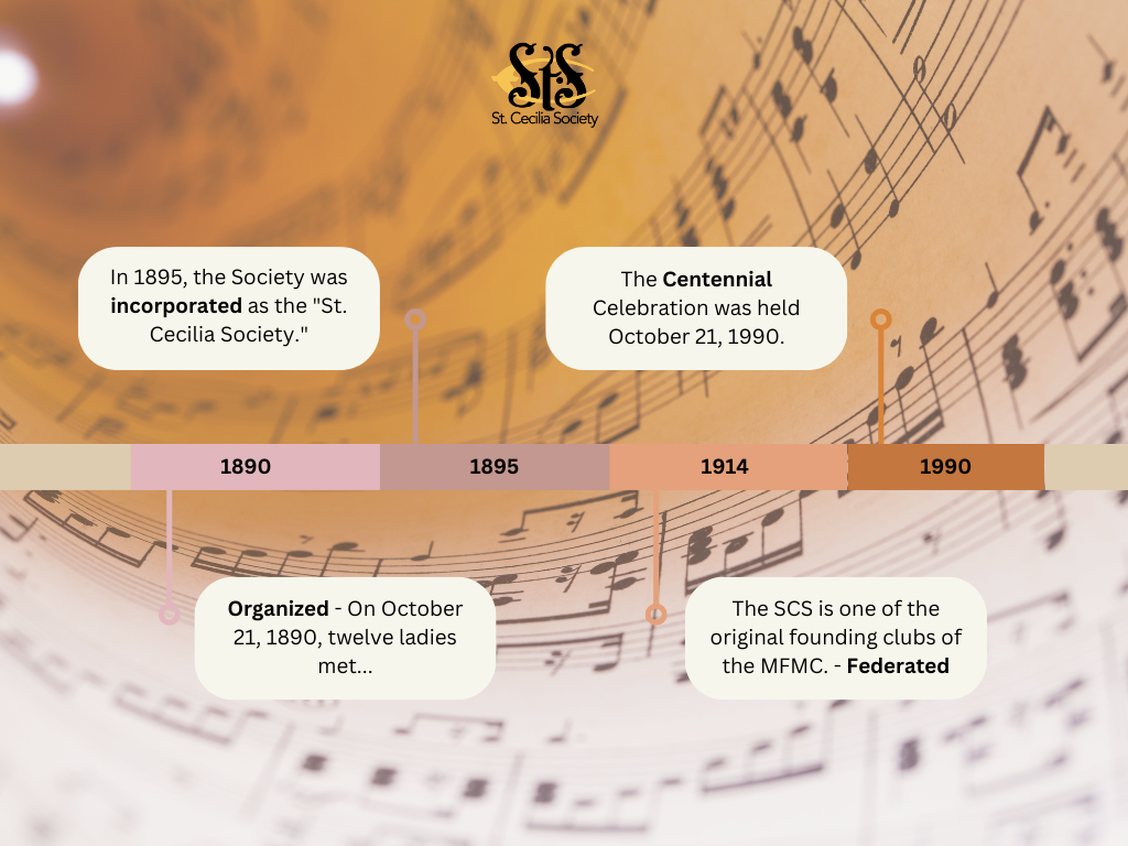 The St. Cecilia Society was founded in 1890 when twelve ladies met at the home of Mrs. J. Dallas Dort (Nellie Bates) to study the improvement of music in the community. Originally, the membership was limited to 35 women, but the group has grown to include all men and women who wish to belong for the purpose of promoting musical endeavors in the Flint area.
